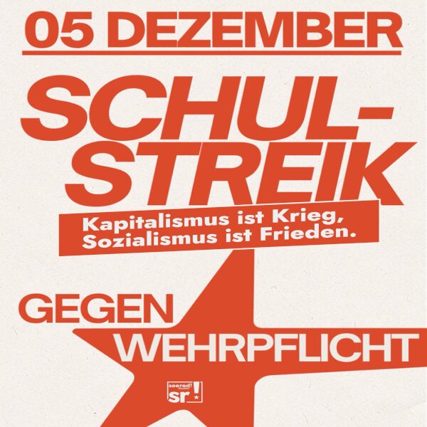 - Schulstreik gegen Wehrpflicht am 5.12.25!Auch wir rufen alle Schüler:innen und Unterstützer:innen auf, am 5.12.25 gemeinsam gegen Wehrpflicht und „Kriegstüchtigkeit“ zu streiken. Während Corona und danach im Stich gelassen und als „faule Gen Z“ abgestempelt, sollen junge Menschen jetzt geopolitische Machtspiele mitspielen und als Kanonenfutter verheizt werden. Wir sagen klar: Keine Wehrpflicht für die Interessen… Schulstreik gegen Wehrpflicht am 5.12.25! weiterlesen