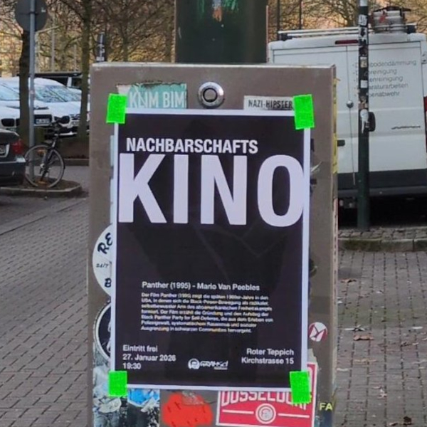 - Nachbarschaftskino: Panthers, 27.1.26Es ist wieder soweit: Am 27.1. wird im Nachbarschaftskino ein Film über die BlackPanther gezeigt. 19 Uhr, Roter Teppich, Kirchstr. 15, Eintritt frei. Der Film Panther (1995) zeigt die späten 1960er-Jahre in den USA, in denen sich die Black-Power-Bewegung als radikaler, selbstbewusster Arm des afroamerikanischen Freiheitskampfs formiert. Der Film erzählt… Nachbarschaftskino: Panthers, 27.1.26 weiterlesen